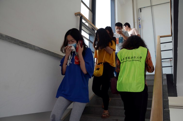 6月28日下午4點(diǎn)整,隨著演練總指揮呂家瓏一聲令下,“西北農(nóng)林科技大學(xué)資環(huán)學(xué)院消防應(yīng)急疏散演練活動開始!”學(xué)院消防演練活動拉開帷幕。16點(diǎn)02分,佟小剛老師報告,“413實(shí)驗室有疑似火情,有明火及大量濃煙冒出”,指揮組立即調(diào)配學(xué)院應(yīng)急救護(hù)隊趕赴現(xiàn)場緊急施救,高峰等校衛(wèi)隊員也迅速到達(dá)413實(shí)驗室進(jìn)行支援,全力進(jìn)行撲救。為保證安全,疏散組組長田長河通知各樓層負(fù)責(zé)人組織全樓師生疏散,并通過廣播拉響警報,通報火情,指導(dǎo)師生用濕毛巾捂住口鼻,保持低姿沿樓梯靠墻一側(cè)有序撤離。在撤離過程中,指揮組還接到了六樓東側(cè)602實(shí)驗室有人員受傷的求救信息,應(yīng)急救護(hù)隊員在收到指揮組命令后也立即開展救護(hù)工作,對傷員進(jìn)行包扎和緊急處理,并轉(zhuǎn)移至安全地帶。