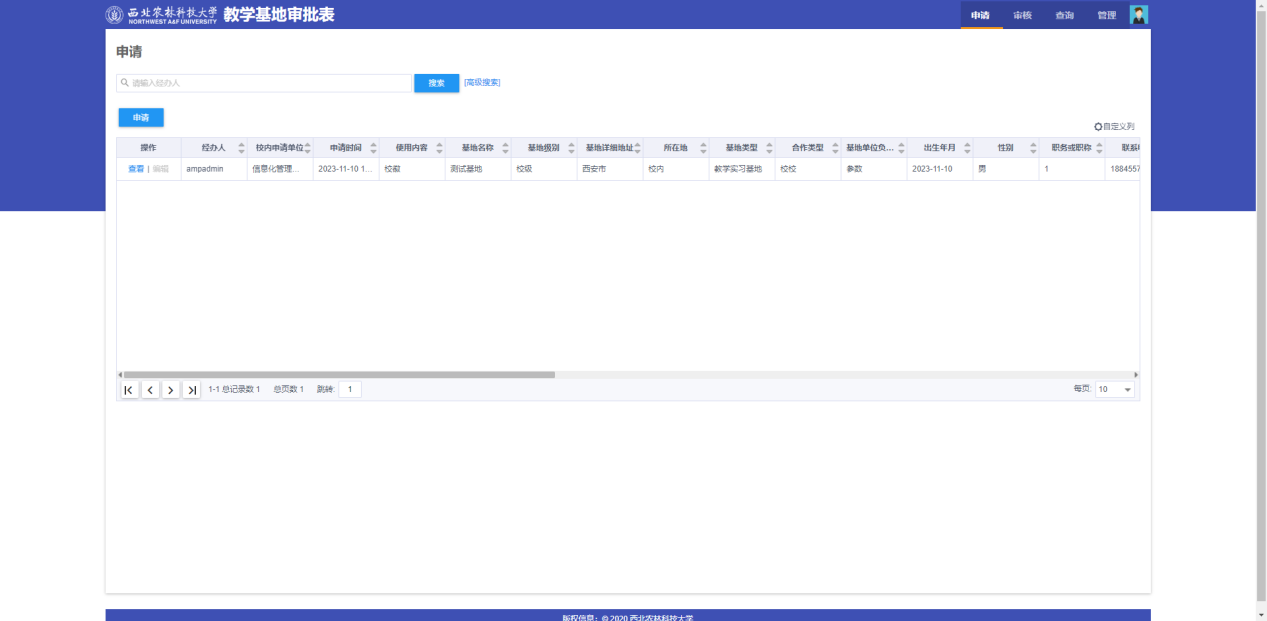 教學(xué)基地審批表申請(qǐng)界面如下圖,點(diǎn)擊申請(qǐng)按鈕