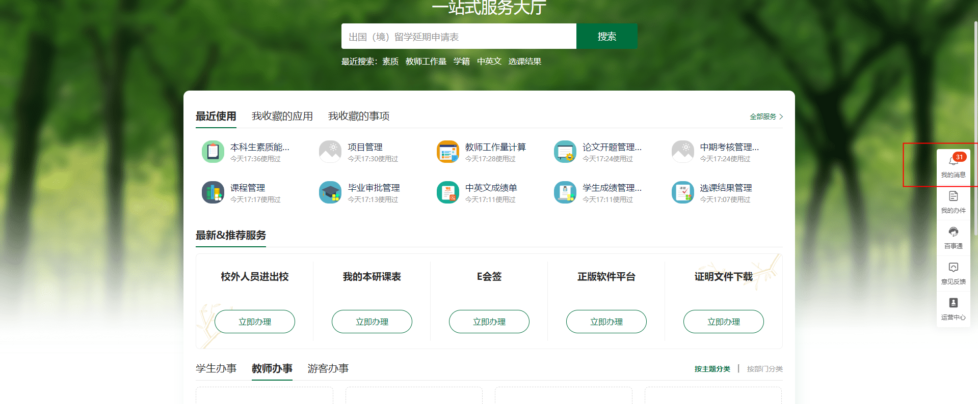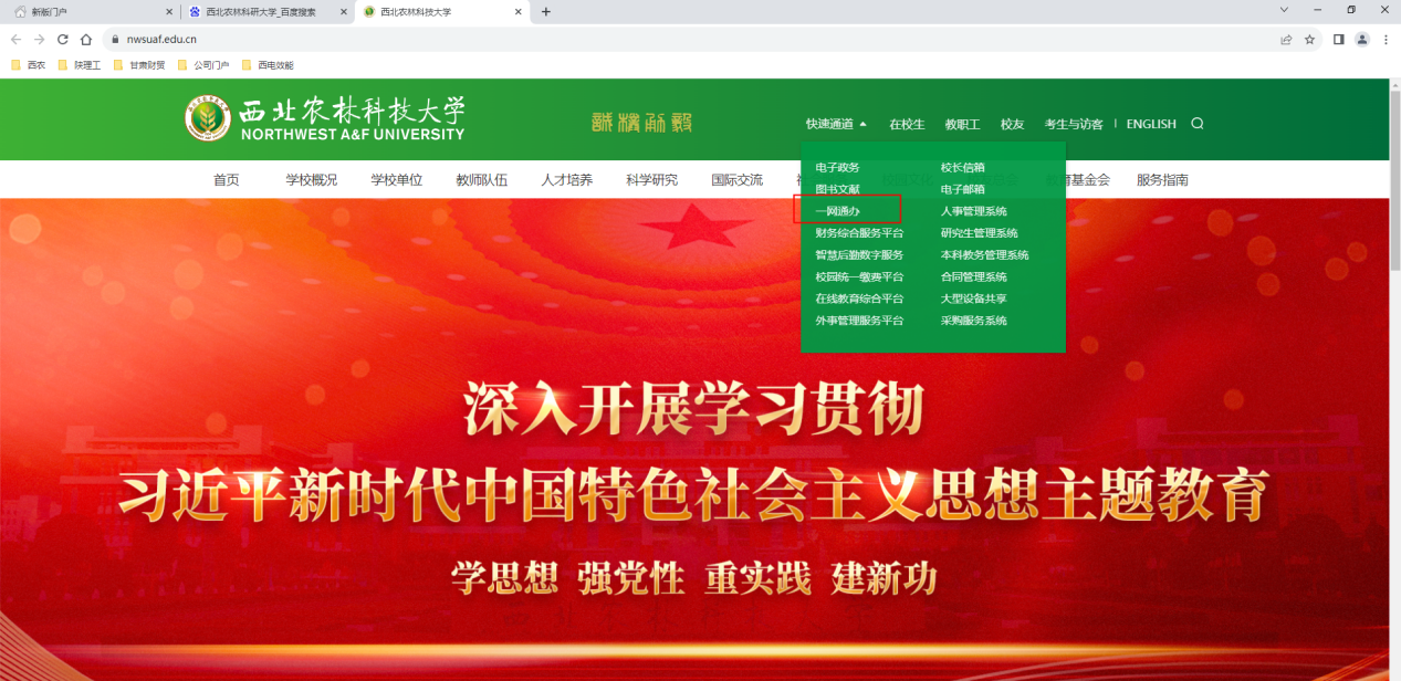 1.PC端瀏覽器訪問學(xué)校官網(wǎng),點(diǎn)擊快速通道,進(jìn)入學(xué)校“一網(wǎng)通辦”平臺(tái)