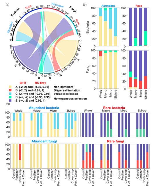 本研究基于西北農林科技大學白水蘋果試驗站的12年長期定位試驗,調查了長期不施肥、單施化肥、生草覆蓋、生草覆蓋配合化肥4個處理下土壤不同粒徑團聚體(> 0.25 mm;0.053-0.25 mm;< 0.053 mm)細菌和真菌群落結構,并對細菌、真菌的“豐富”和“稀有”菌群進行了群落裝配分析。研究發(fā)現(xiàn)在豐富的細菌群落構建過程中,環(huán)境選擇的重要性從大團聚體到小團聚體呈現(xiàn)增加的趨勢。稀有細菌的群落裝配過程受同質性選擇影響,并且隨著土壤有機碳和全氮含量的降低同質性選擇的作用逐漸減弱。豐富真菌群落在團聚體中的裝配過程主要受隨機性過程主導,而稀有真菌群落主要受同質性選擇和擴散限制共同主導。研究還發(fā)現(xiàn),團聚體的發(fā)育團聚過程使豐富、稀有真菌和細菌群落結構趨于相似,但不同粒徑團聚體的環(huán)境條件不同又會使其產生各自的獨有菌種。而且豐富真菌、細菌可能是團聚體團聚的促進者,而稀有細菌可能是團聚體內功能的“種子庫”。該研究為旱地蘋果園長期生草覆蓋與施肥條件下土壤肥力發(fā)育的微生物學機制提供理論依據(jù)。