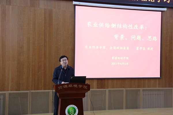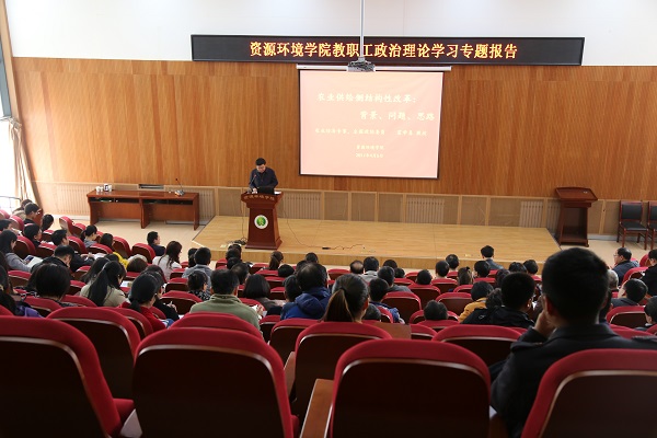 4月5日下午,資環(huán)學(xué)院全體教職工在學(xué)院報告廳共同學(xué)習(xí)了中央一號文件,認(rèn)真聽取了全國政協(xié)委員霍學(xué)喜教授以“農(nóng)業(yè)供給側(cè)結(jié)構(gòu)性改革”為主題的專題報告。報告會由院黨委書記閆德忠主持。
