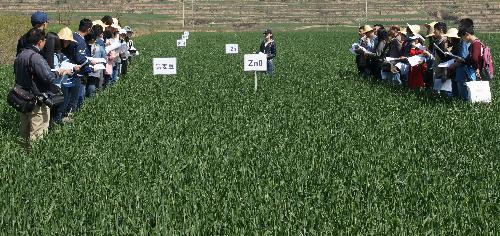 來到基地后,負責人先為大家介紹了基地的建設(shè)和發(fā)展,并帶領(lǐng)大家參觀了基地設(shè)施。之后,大家一起走進試驗田,負責綠肥活化土壤鋅、小麥品種營養(yǎng)差異、綠肥與氮磷配合、夏閑保水增產(chǎn)、覆膜栽培養(yǎng)分調(diào)控等田間試驗的研究生,分別結(jié)合田間小麥的苗情長勢,向老師和同學們詳細講解了他們各自試驗的研究目的、研究內(nèi)容、試驗設(shè)計,典型效果,理論和應(yīng)用意義等內(nèi)容,并認真回答了老師和同學們的提問,就有關(guān)問題和處理之間的差異表現(xiàn)還進行了深入討論。通過現(xiàn)場交流與學習,讓大家更加深入地理解了相關(guān)研究工作的目的,認識了各試驗設(shè)計原理與意義,體會到了試驗精心實施與認真管理是多么重要,明白了理論知識與實踐應(yīng)用結(jié)合的重要性。