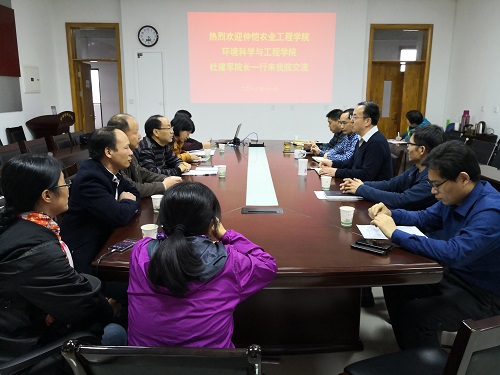 2018年11月24日下午,仲愷農業(yè)工程學院環(huán)境科學與工程學院杜建軍院長一行5人來學院調研交流,就資源利用與植物保護專業(yè)碩士培養(yǎng)等情況進行交流。學院呂家瓏院長、王旭東副院長、李志副院長、周建斌教授、梁東麗教授、田匯副教授及辦公室相關人員參加了座談會。會議由呂家瓏院長主持。