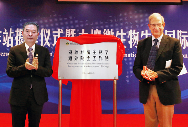 校黨委書記李興旺和詹姆士?迪杰院士為資源環(huán)境生物學(xué)海外院士工作站揭牌