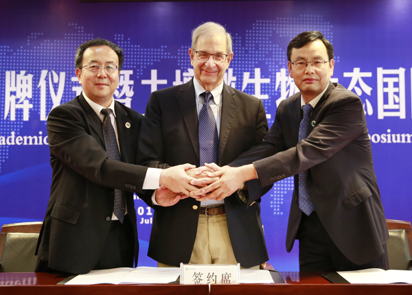 副校長(zhǎng)馬建華、資環(huán)學(xué)院院長(zhǎng)呂家瓏教授與詹姆士?迪杰院士簽訂合作協(xié)議