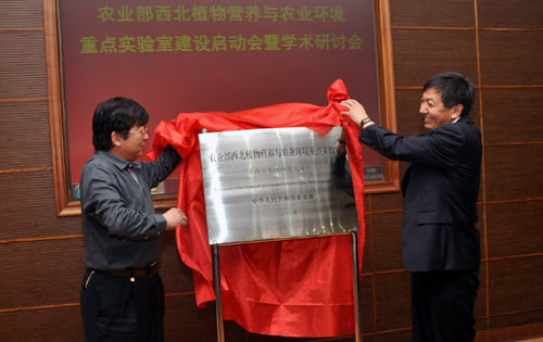 副校長吳普特和“農(nóng)業(yè)部植物營養(yǎng)與肥料綜合實驗室”副主任白由路(右)為實驗室揭牌
